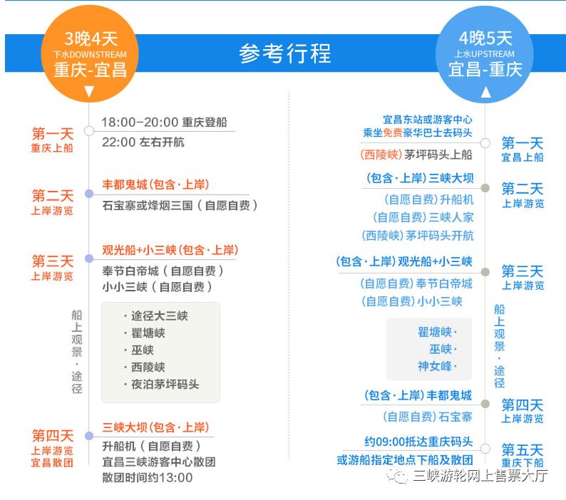 下水重庆到宜昌的行程一般只有4天,由于游船是顺水行舟,所以行驶速度较快,平均时速在28-30公里/小时。时间短,行程较为紧凑。